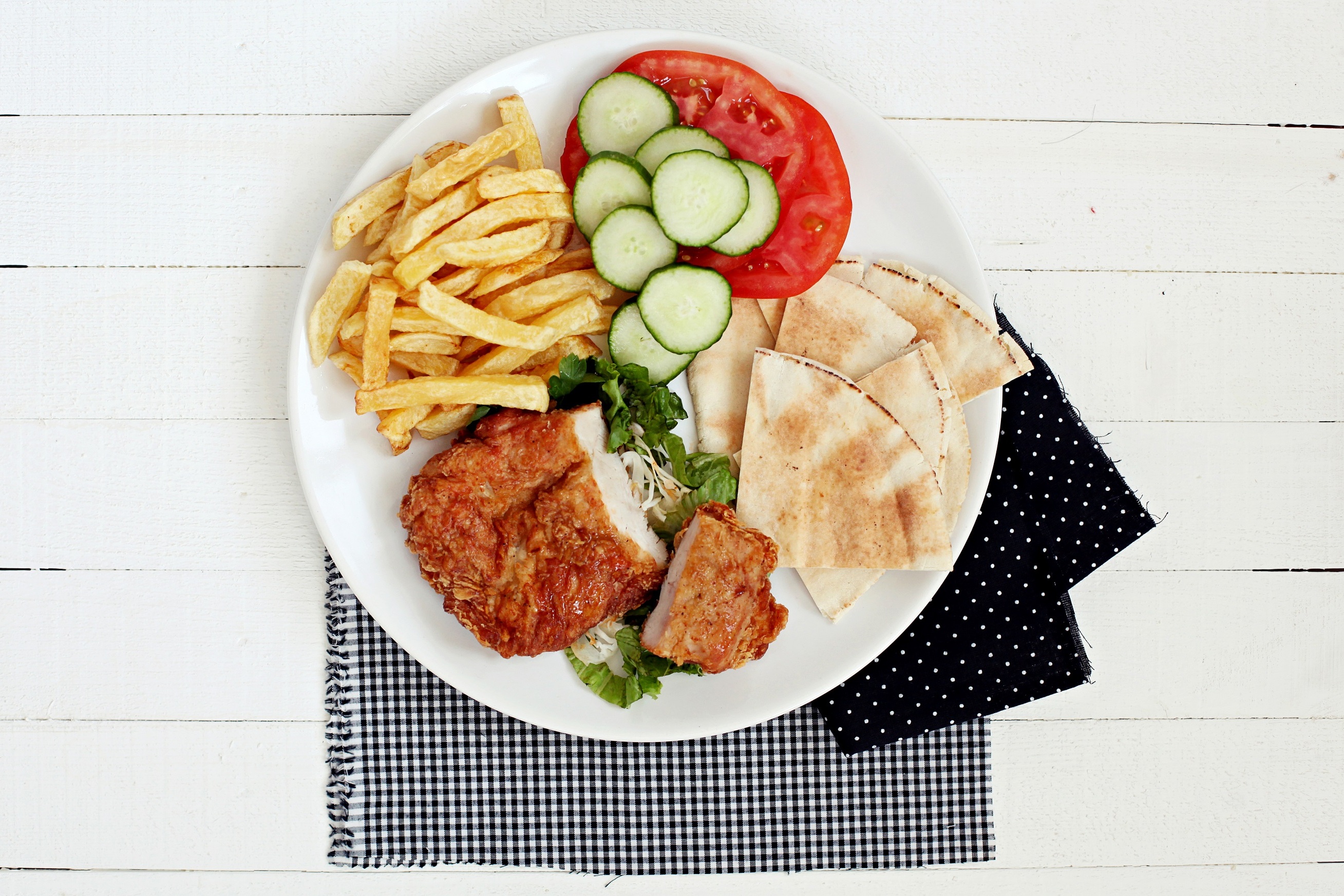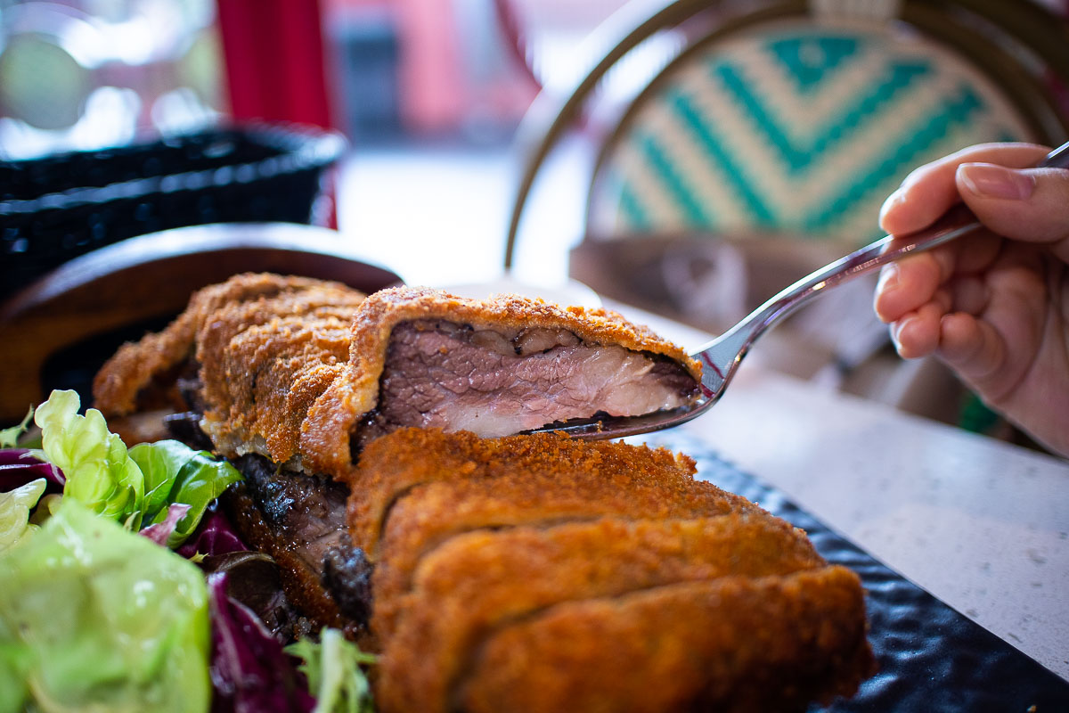 Marinated grill beef fillet topped with Fried egg served with vegetable And French fries
