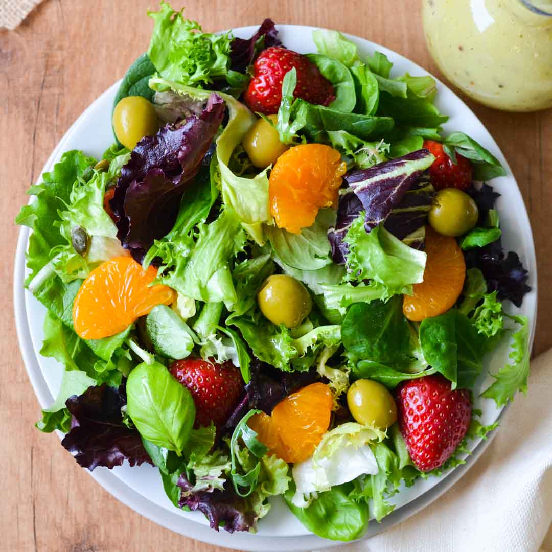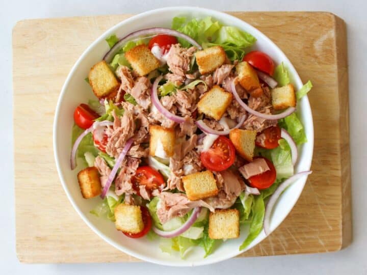 Lettuce, tuna, carrot, black olive, green pepper, olive oil, tomato, onion served with lemon dressing