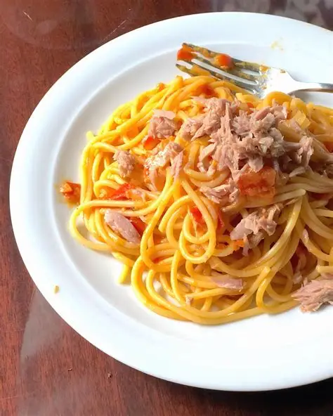 Spaghetti, Tomato paste, Tuna, Soyasos, Black pepper, Azmerino, salt,Veg.oil, celery